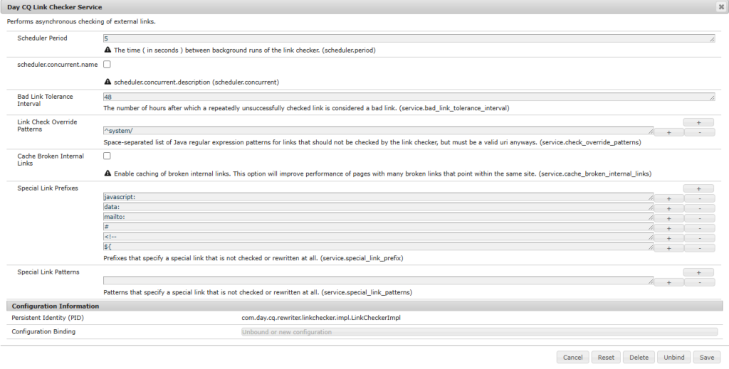 - Avoid enabling Link Checker at scale on very large, highly dynamic repositories. The event volume under /content can produce heavy processing and large /var/linkchecker trees.